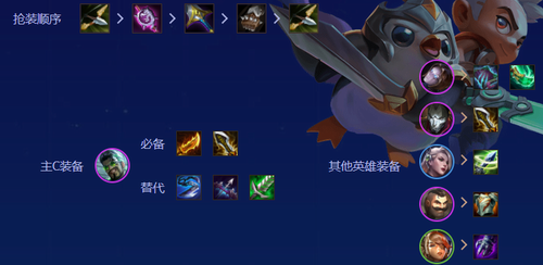 核心输出位德莱文优先配置巨人杀手与无尽之刃,搭配水银形成三件套。副C发条魔灵必备莫雷洛秘典,奎因配置伏击之爪提升容错。前排布隆推荐石像鬼板甲与狂徒铠甲组合,烬作为物理副C可继承多余攻击装,防御型装备优先保障布隆释放两次控制技能。